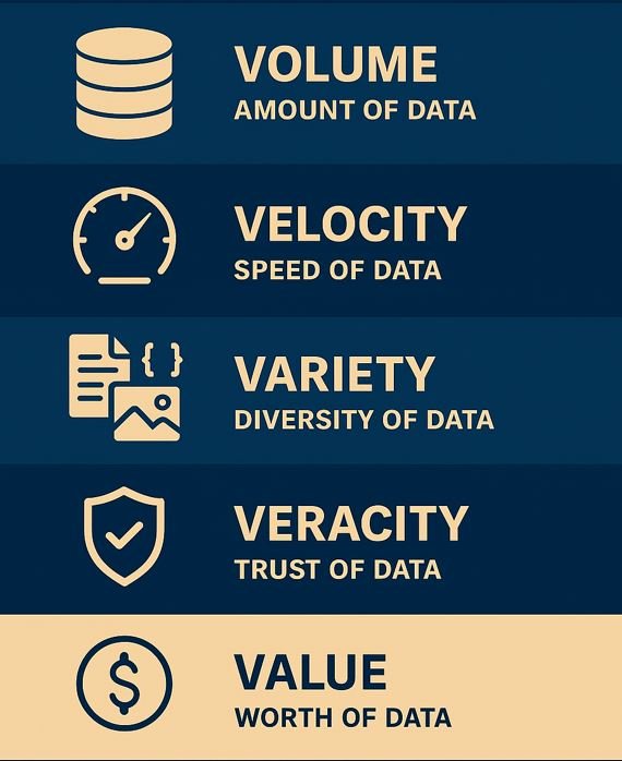 These five dimensions — Volume, Velocity, Variety, Veracity, and Value — help us understand the challenges and opportunities that come with large‑scale data ecosystems. Let’s break them down and explore why they matter more than ever.